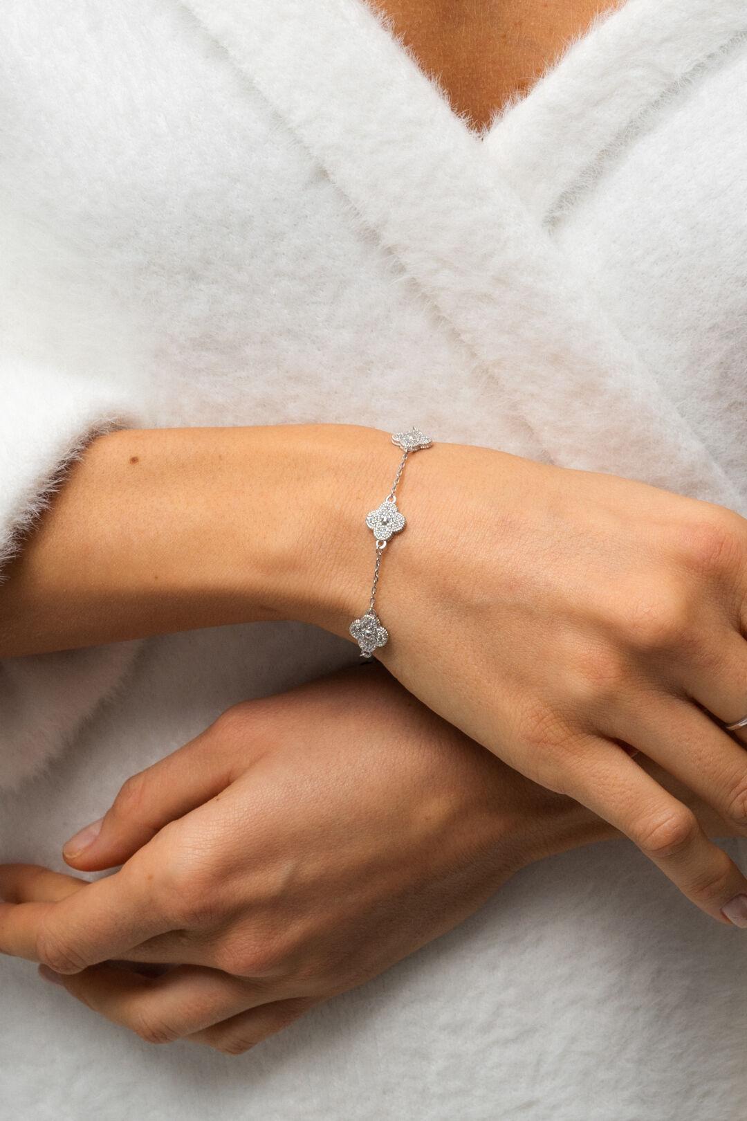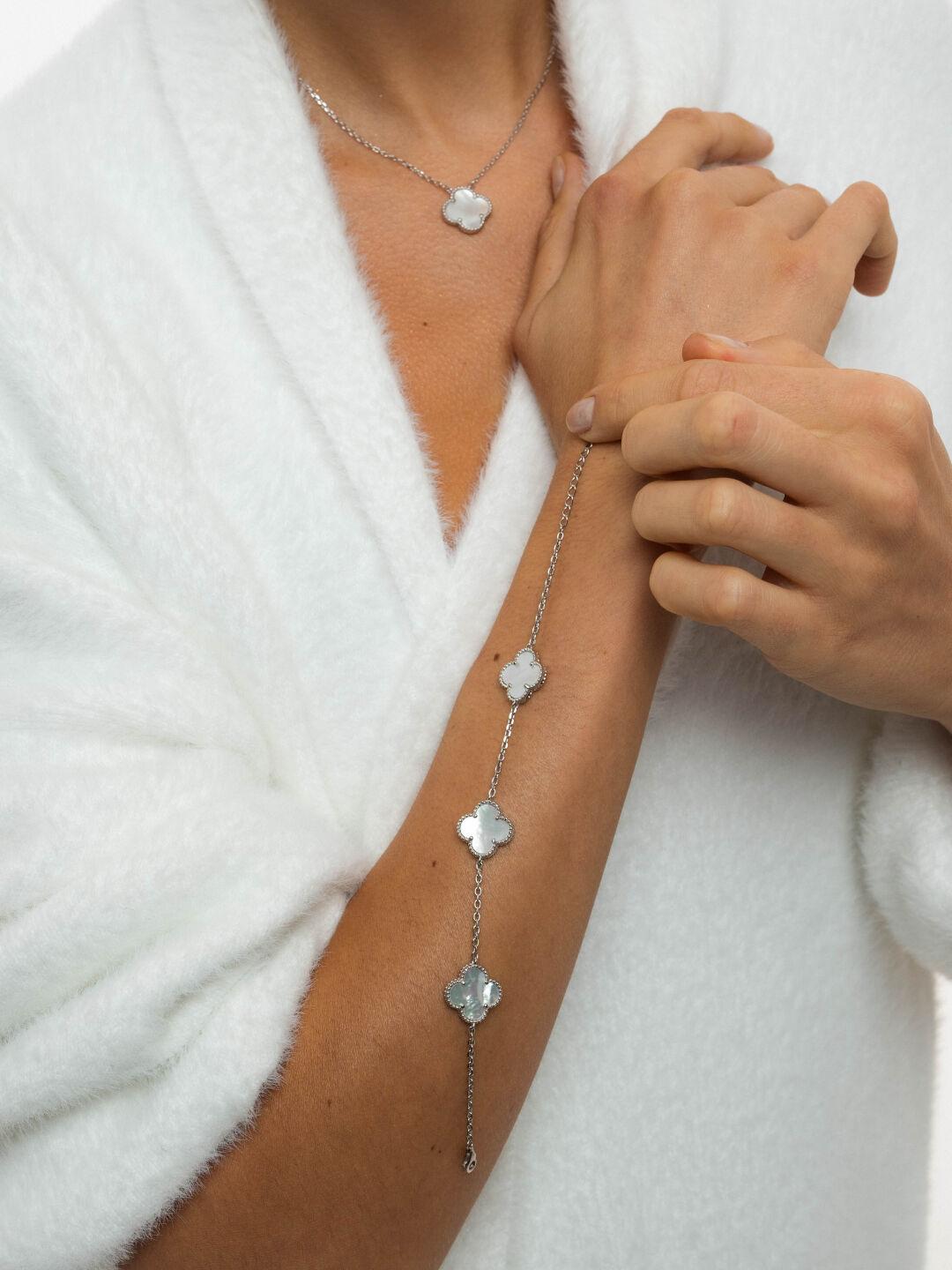 Срібний браслет з перламутром Клевер 3 вставки Стильний срібний браслет з трьома вставками з перламутру. Довжина регулюється – 17-19 см.2500.00 грнКупити