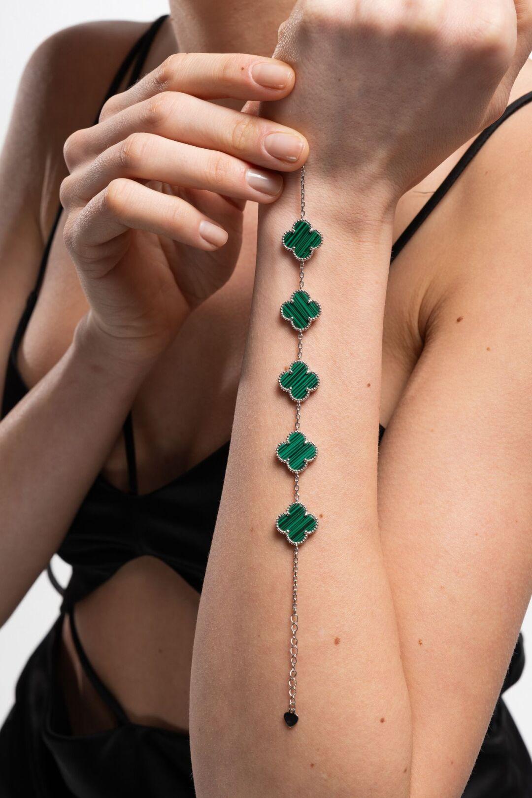 Срібний браслет Клевер з малахітом 5 вставокВишуканий срібний браслет зі вставками малахіт. Довжина браслета регулюється – 17-20 см.2600.00 грнКупити